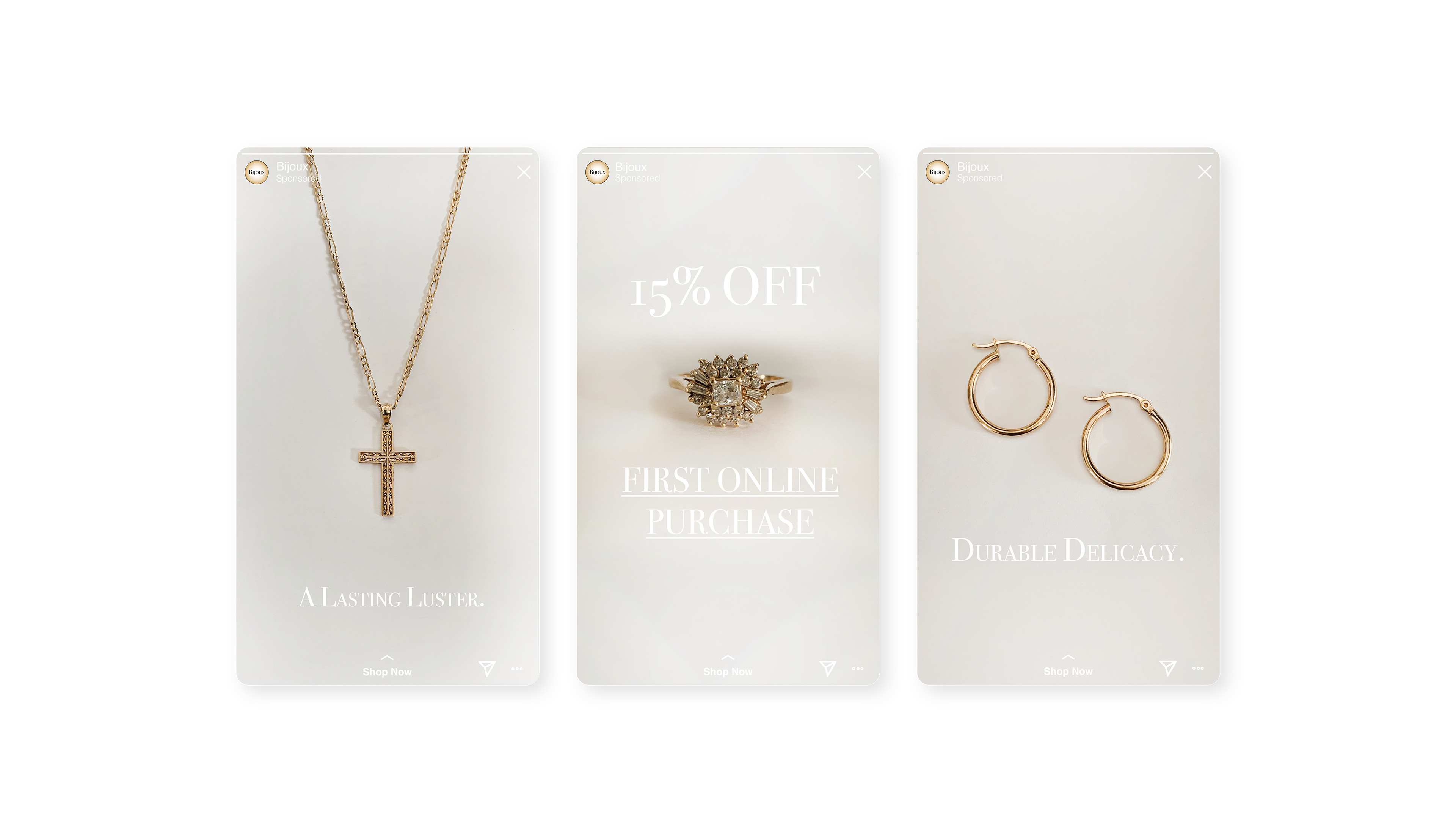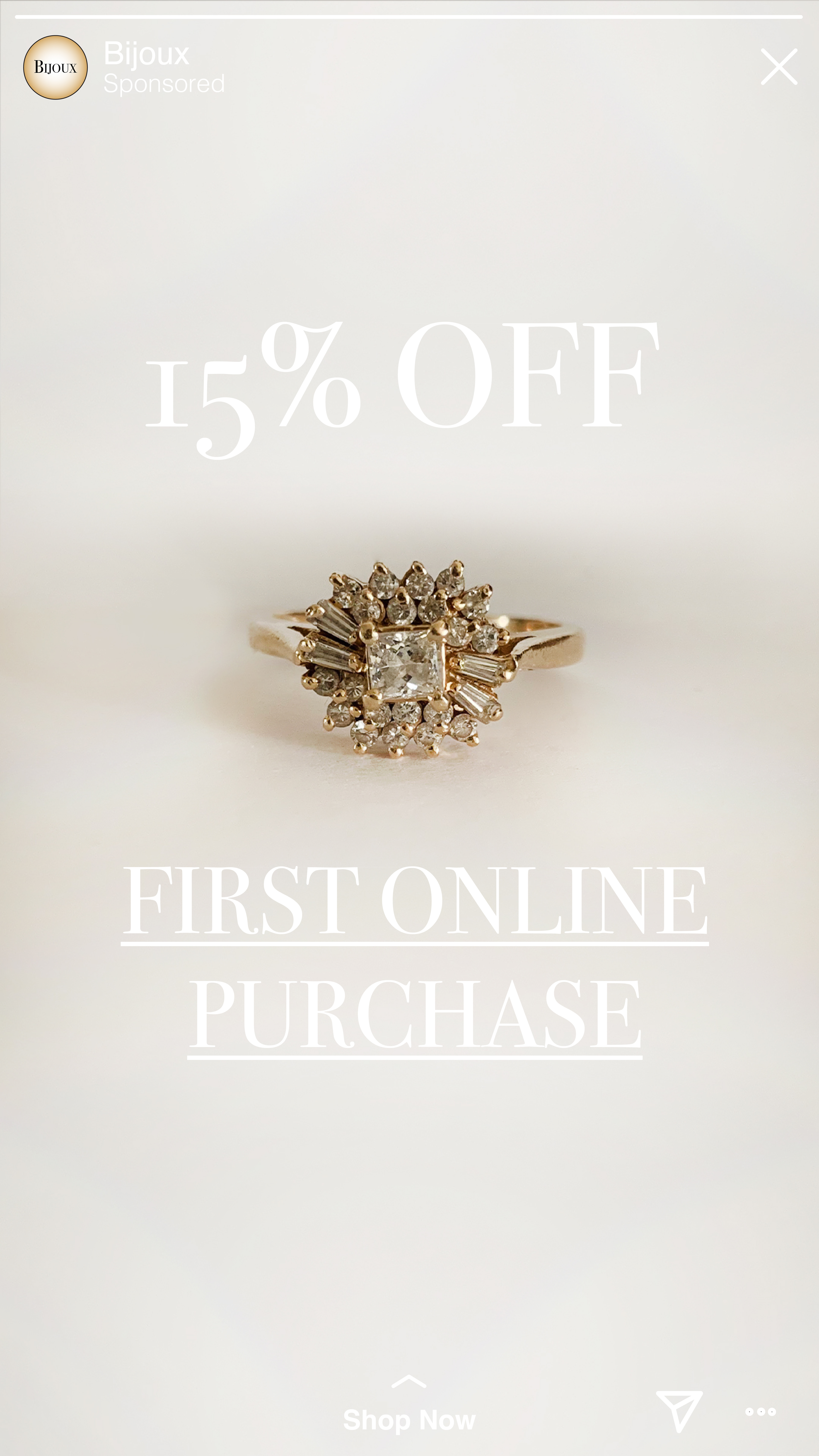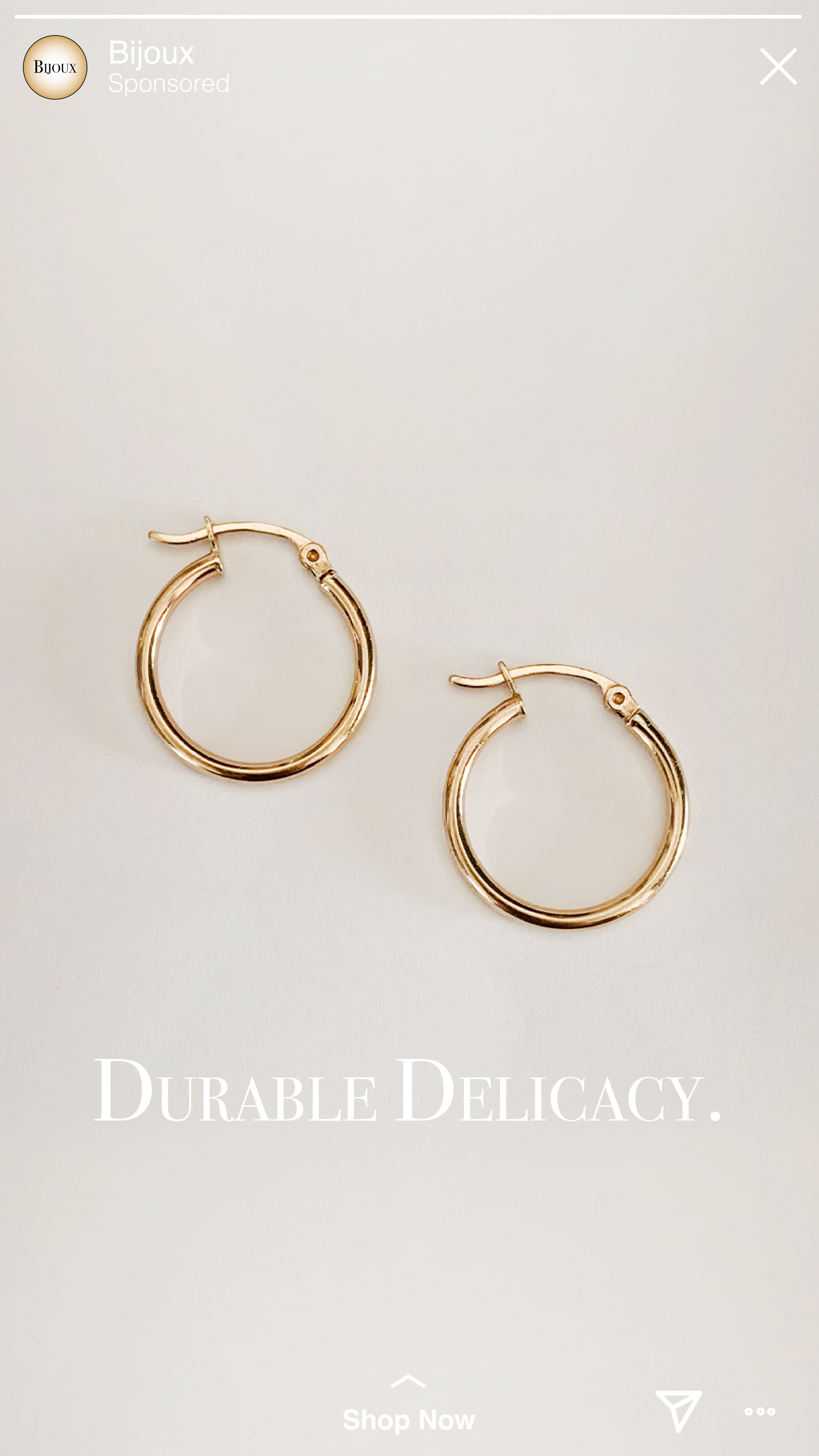 A social media mockup of the jewelry brand "Bijoux" All elements, including share icons and user interface, was designed using Adobe Illustrator. Photos were taken and edited by Rachel Jones using Adobe's Photoshop